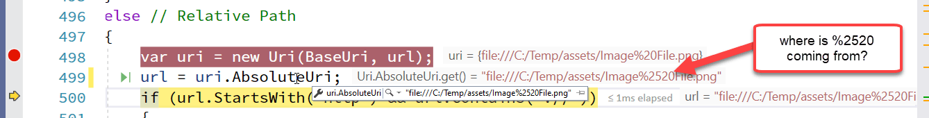 This creates incorrectly encoded values for AbsoluteUrl and LocalPath: