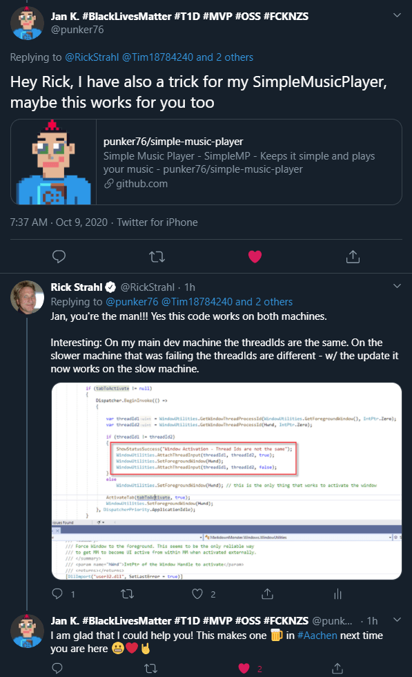 Unfortunately that code turned out to do a whole lot of nothing when Markdown Monster is already running and a document is loaded from Explorer or the Shell. The behavior didn't change - MM comes to the top, editor looks focused, but keyboard input doesn't go into MM. Crap - no low hanging fruit here.